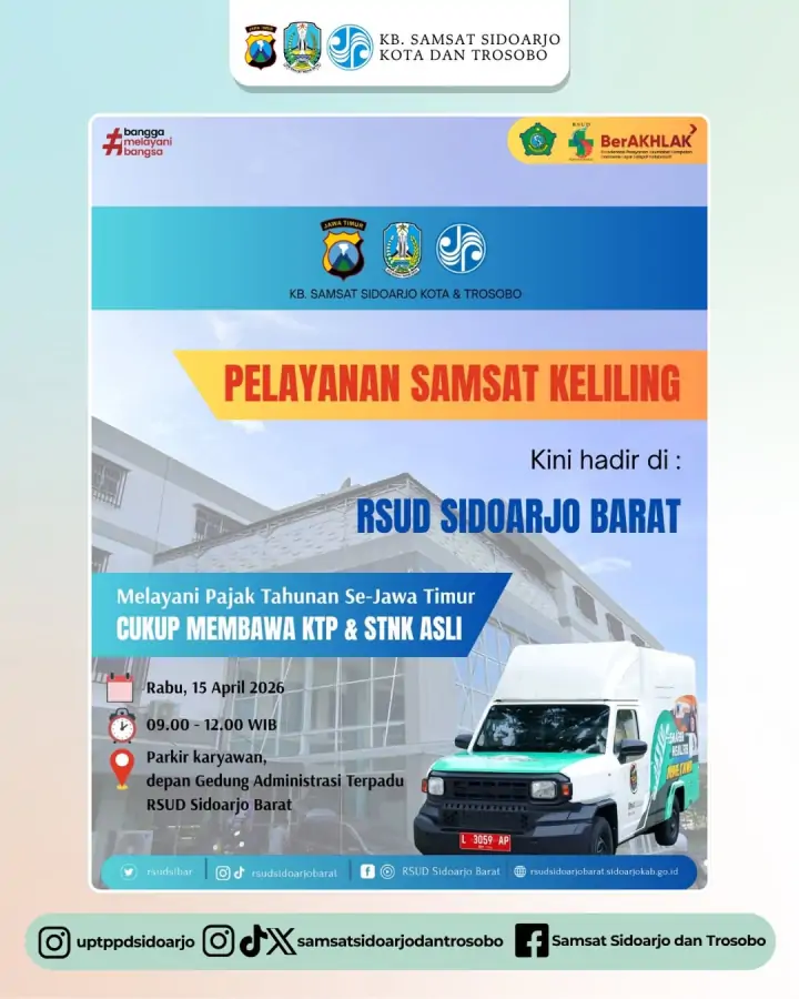 Layanan Samsat Keliling, yang akrab disapa "Sam-Rene", dijadwalkan hadir untuk melayani wajib pajak di RSUD Sidoarjo Barat pada Rabu, 15 April 2026.